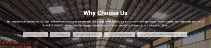 We are one of the biggest manufacturers of smart door locks for years, from Guangzhou, China. Our product range is as below:WiFi/Bluetooth APP Door Locks;Fingerprint Door Locks;Face Door Locks; Hotel Door Locks;Digital Door Locks;Electronic Door Locks;RIM Door Locks and so on.We company build up a strong R&D team and devote the energy into developing high quality, newly patents, and most-cost effective products. We are qualified with certificates such as CE RoSH FCC ISO9001.